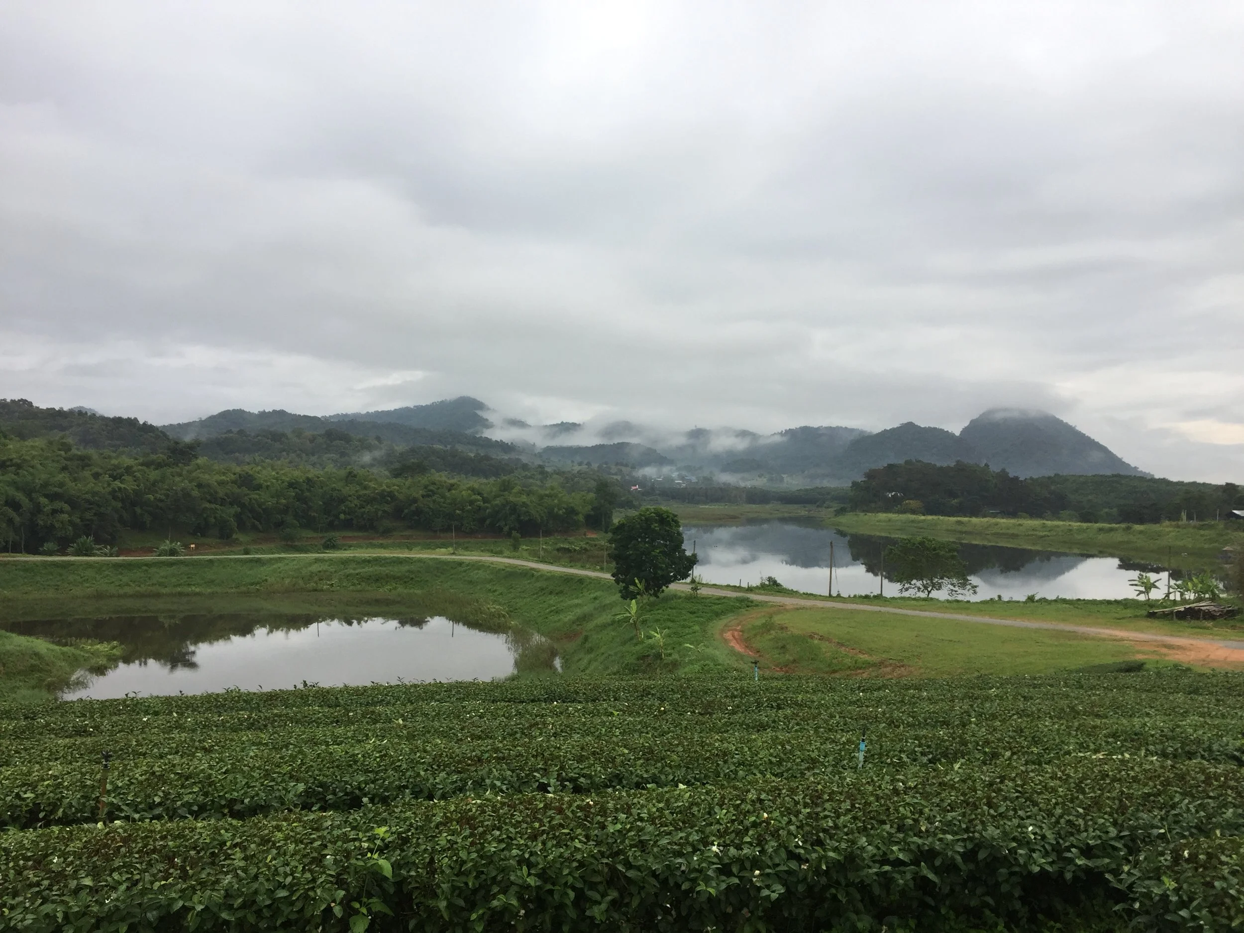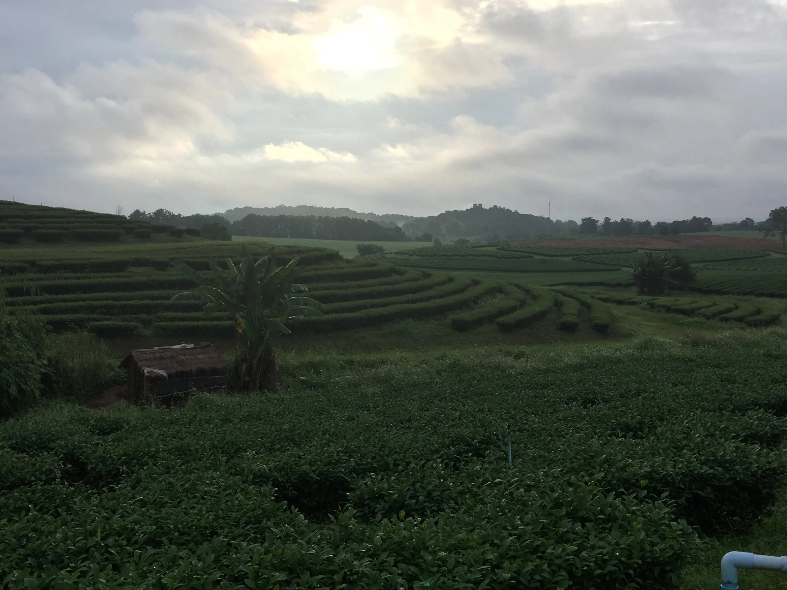 Walking through the Singha tea and beer gardens in Chiang Rai at sunrise.