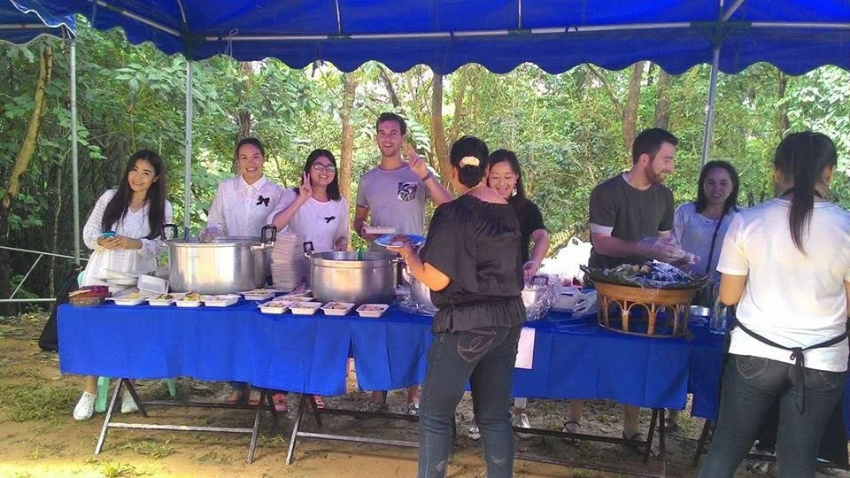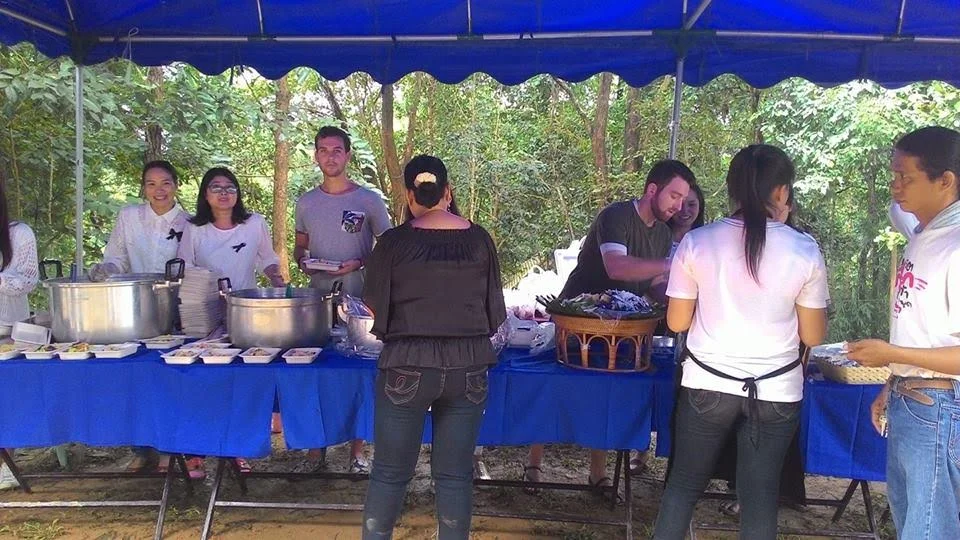 On our last afternoon in Chiang Rai, we joined our host for a ceremony that I doubt many outsiders ever see. Her local temple, still mostly under construction, was unveiling their new golden Buddha statue that provided the sanctuary's centerpiece. After making the trek up to the top of the hill with Ni and her neighbors with places of food and dessert, the attendees - who got a kick out of having two foreigners join them - put us to work serving food in the buffet line.